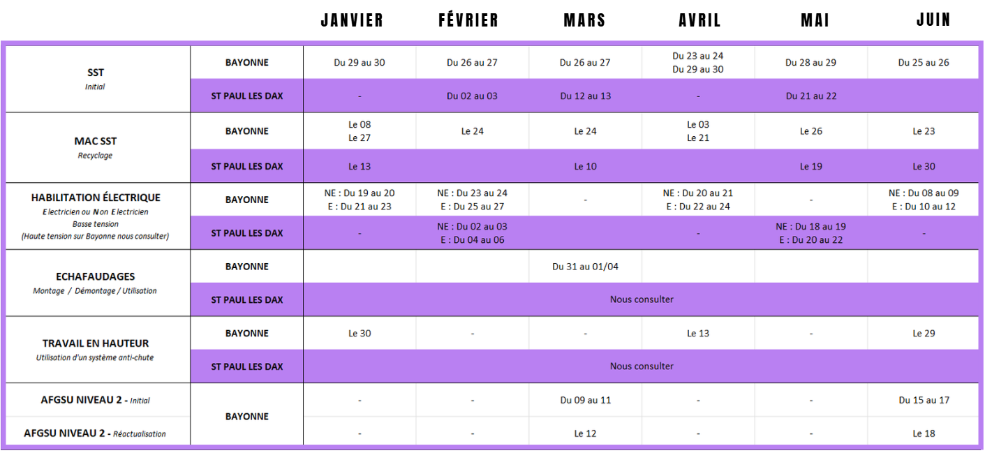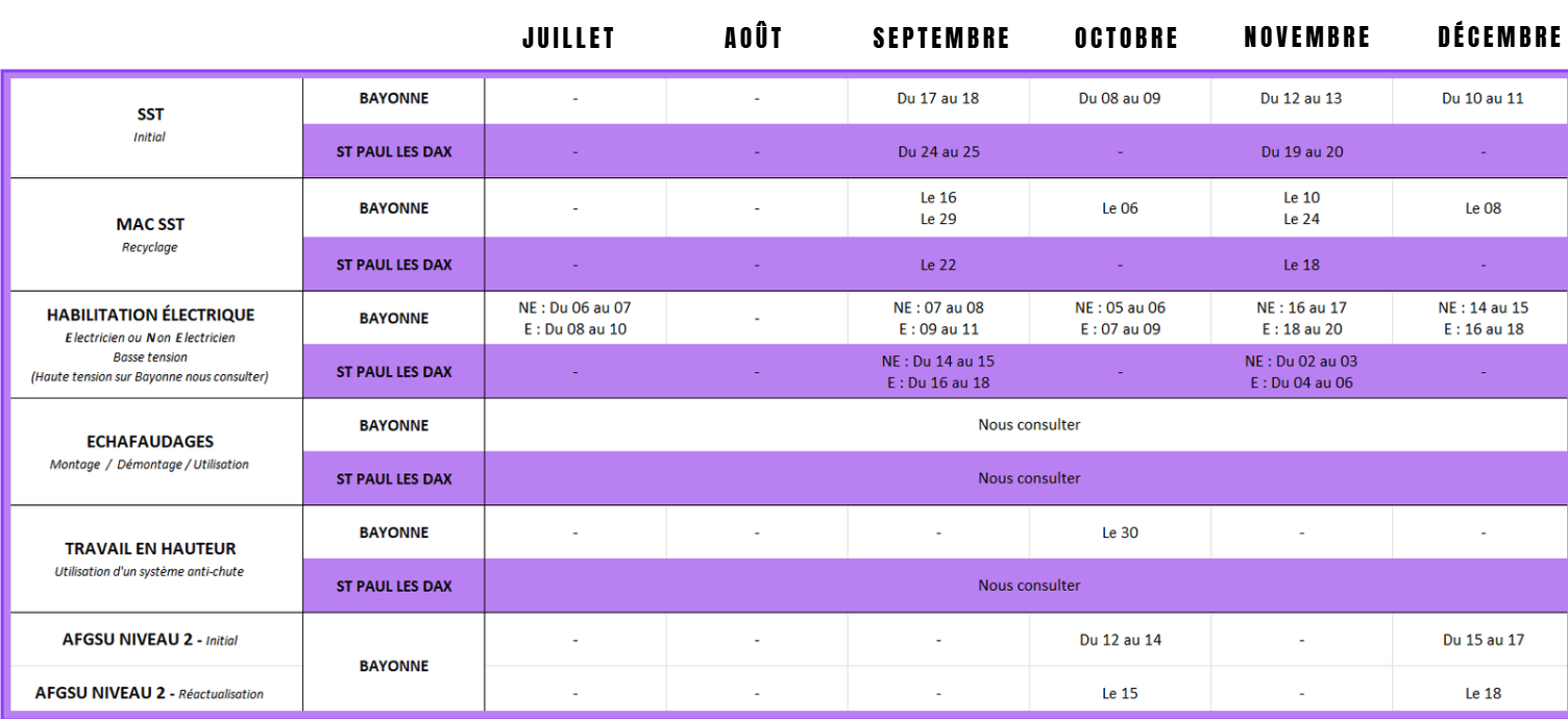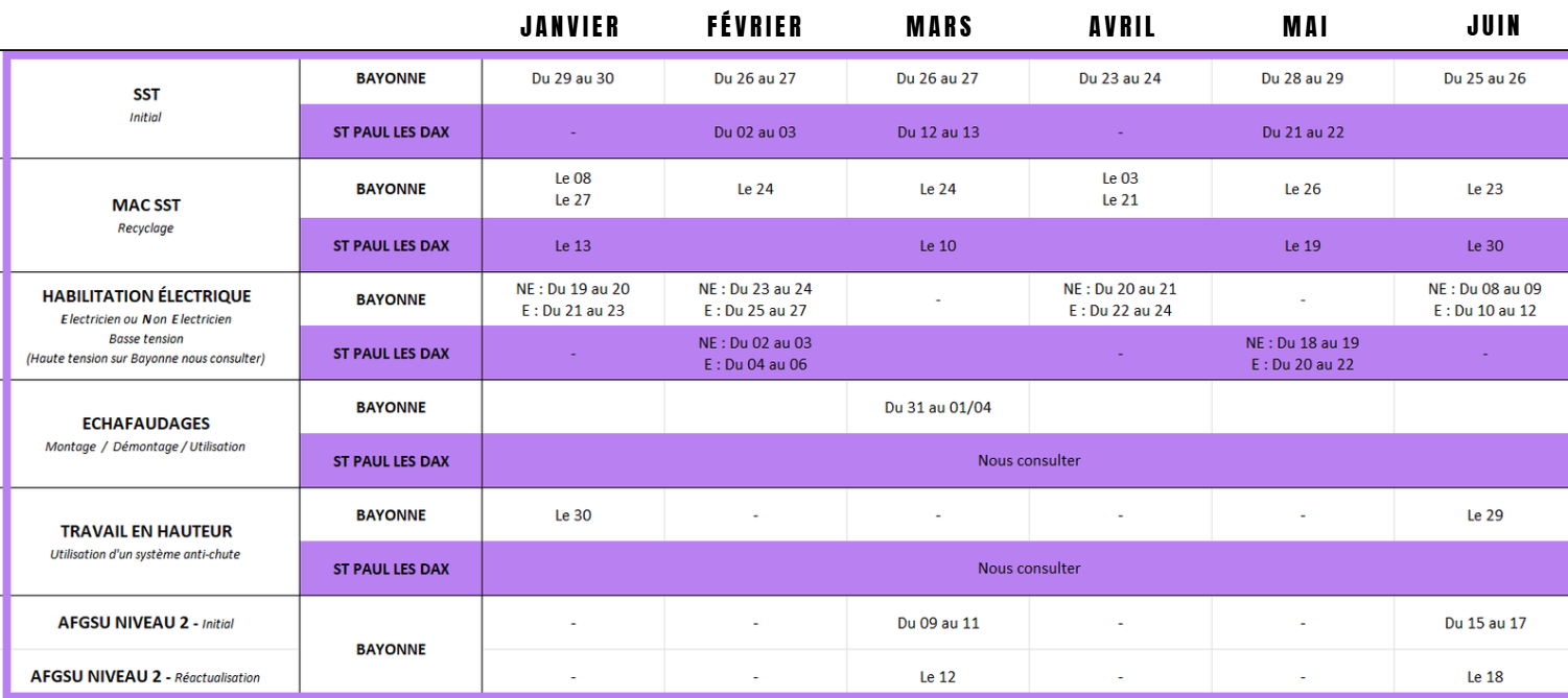 Nos calendriers de formations